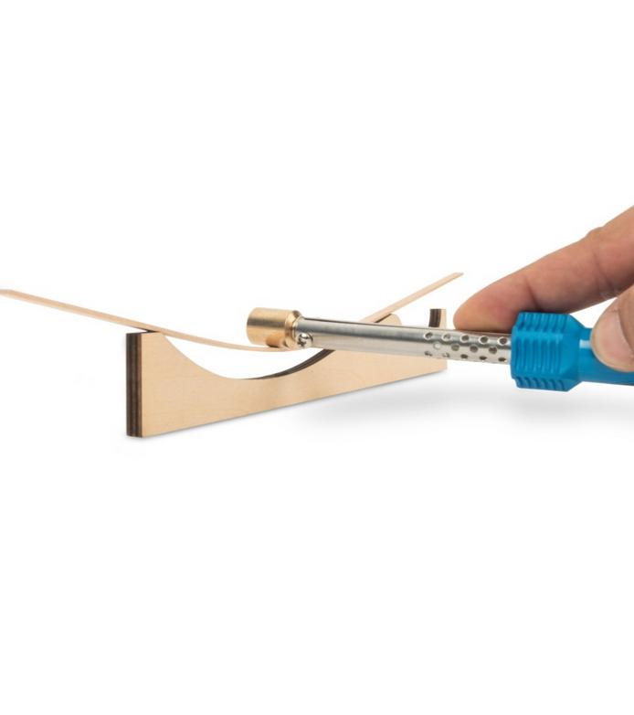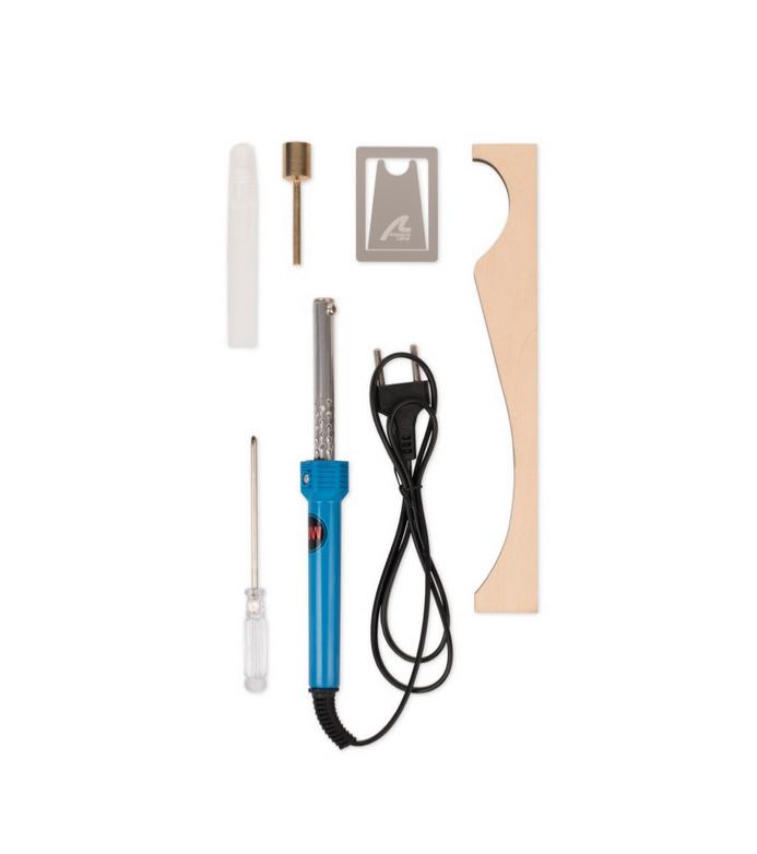 Fer à cintrer électrique est un outil électrique irremplaçable pour plier avec succès n'importe quelle bande jusqu'à 3 mm. Le contenu du kit comporte les éléments suivants : une soudeuse électrique ; une pointe en laiton pour cintrer le bois ; un support métallique pour empêcher le soudeur de brûler la surface de travail ; un tournevis pour serrer la pointe à l'appareil ; un gabarit en bois aux courbes composées ; et, en cadeau ou bonus, un boîte de colle blanche pour les modélistes.