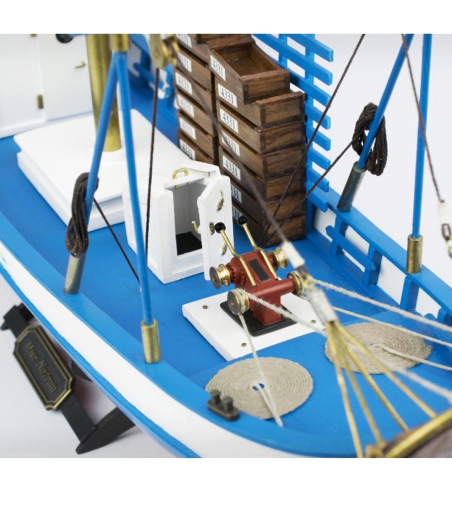 Les chalutiers comme le Mare Nostrum étaient dotés de caractéristiques pratiques adaptées aux besoins des pêcheurs méditerranéens : un treuil pour remonter les filets et les lignes, des poulies robustes pour faciliter la manipulation des équipements, et une poupe surélevée pour optimiser l’espace de travail. Ce modèle de chalutier d’Arenys de Mar reflète les éléments typiques de construction espagnole, que l’on retrouve le long de la Costa Brava et dans d’autres ports méditerranéens.