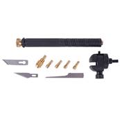 Conçu pour réaliser des travaux fins et délicats, ce porte outils au manche ergonomique anti dérapant et en nylon incassable s'utilise comme un cutter mais il va aussi vous permettre de percer, scier, limer, poncer, maintenir, serrer. Avec le manche sont fournis 2 lames, une lame scie, un mandrin avec 4 pinces en laiton (capacité de 0 à 3 mm) et un mini étau très pratique qui se fixe sur le manche.